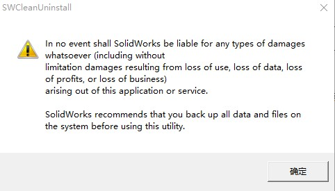 1、打开SWCleanUninstall.exe软件,提示:SolidWorks对任何类型的损害概不负责。由本应用程序或服务引起的任何后果(包括但不限于因使用损失,数据损失,利润损失或业务损失而造成的损害)。