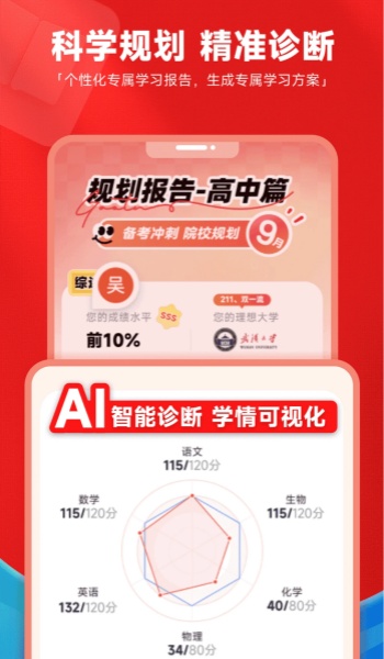 AI 智能教学:AI 学情雷达动态追踪学生学习的薄弱点,逐步拆解高频考点,避免盲目刷题;智能节奏优化,课中解题精讲、举一反三,课后有学习报告追踪并智能优化。