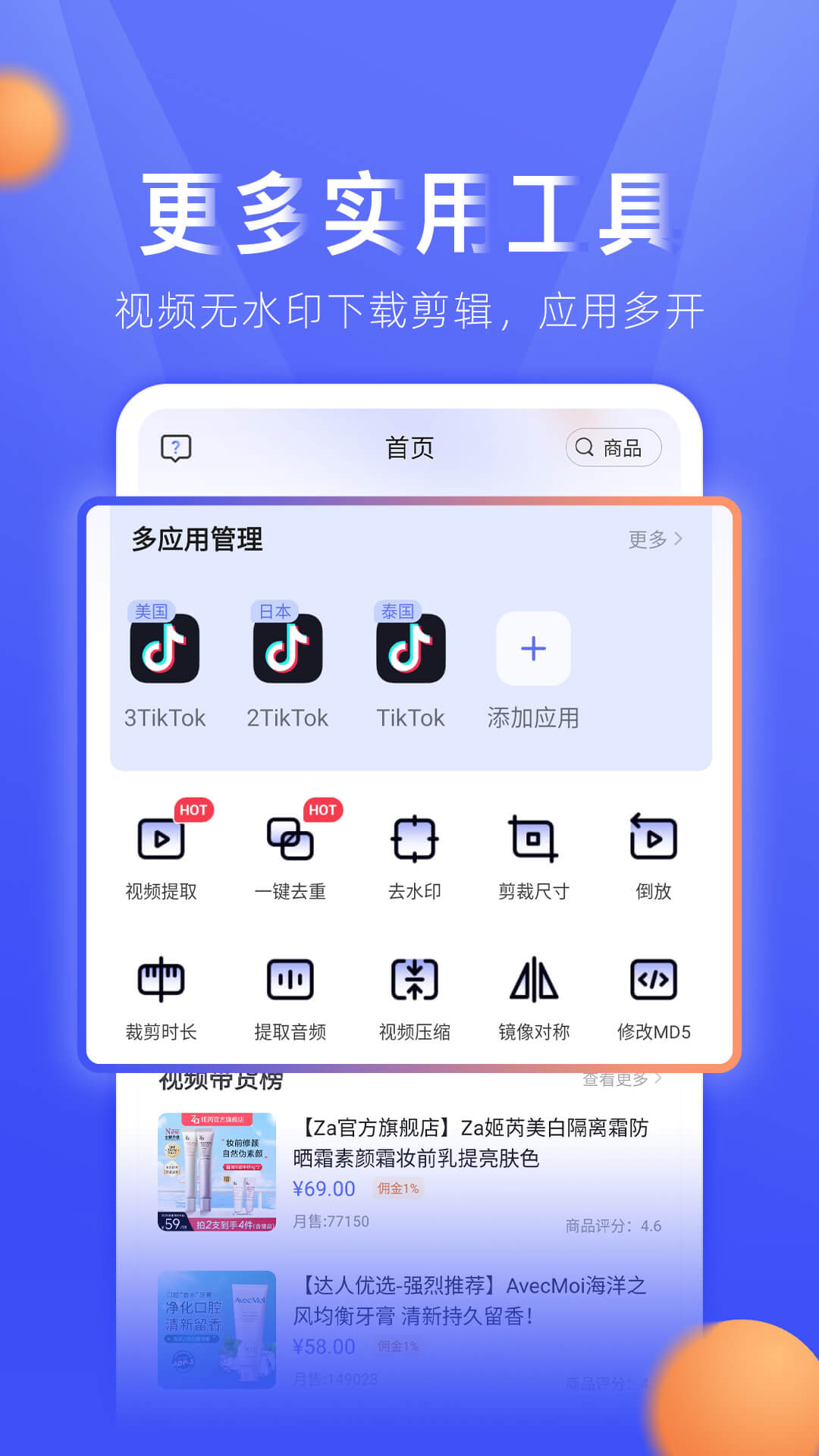 TK小店是一款专业的跨境电商运营助手,登录tiktok后可一键切换国家地区,支持应用多开,各种榜单任您查看,专业的视频处理功能。