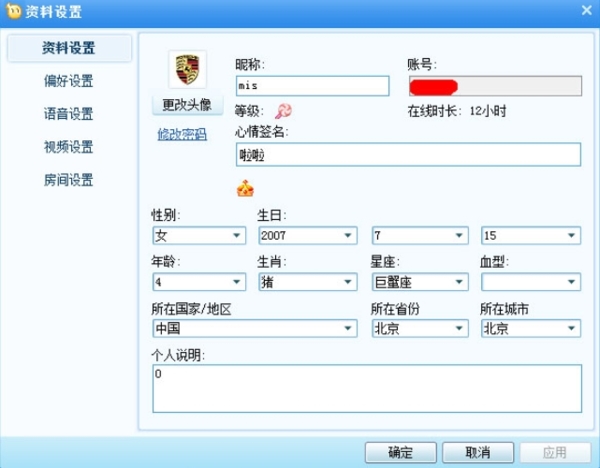 1、在资料设置中,用户可以自定义头像、昵称以及心情签名等个人信息。