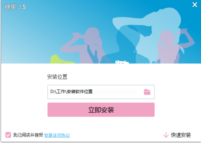 1、打开糖果视频播放器软件安装包,自定义安装可以选任意盘安装路径,点击立即安装。