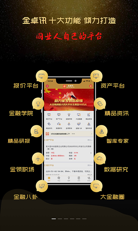 金卓讯APP电脑版是一家金融服务平台,专注于固定收益领域,为金融机构提供同业服务、研究、资讯和数据服务。其十大功能旨在解决信息不对称、提高交易效率,降低成本和风险,促进固收市场发展,并培养金融人才。