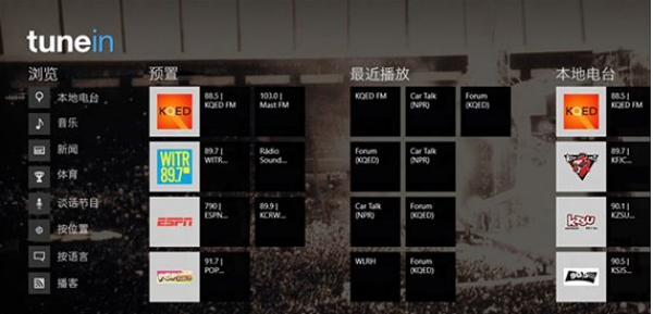 3、用户界面导航:TuneIn Radio界面简洁直观,左侧导航栏包含四个主要选项卡,便于内容发现和音频播放。