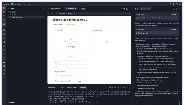 2、项目快速构建:在Builder模式下,开发者告知应用类型,AI自动完成项目搭建任务,实现快速从零到一的项目创建。