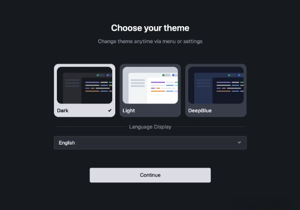 1、启动与设置:安装完成后,点击TraeTrae Windows版图标启动程序,首次启动进入设置界面,选择主题(Dark、Light、DeepBlue)和语言(English、简体中文),完成后点击“Continue”。
