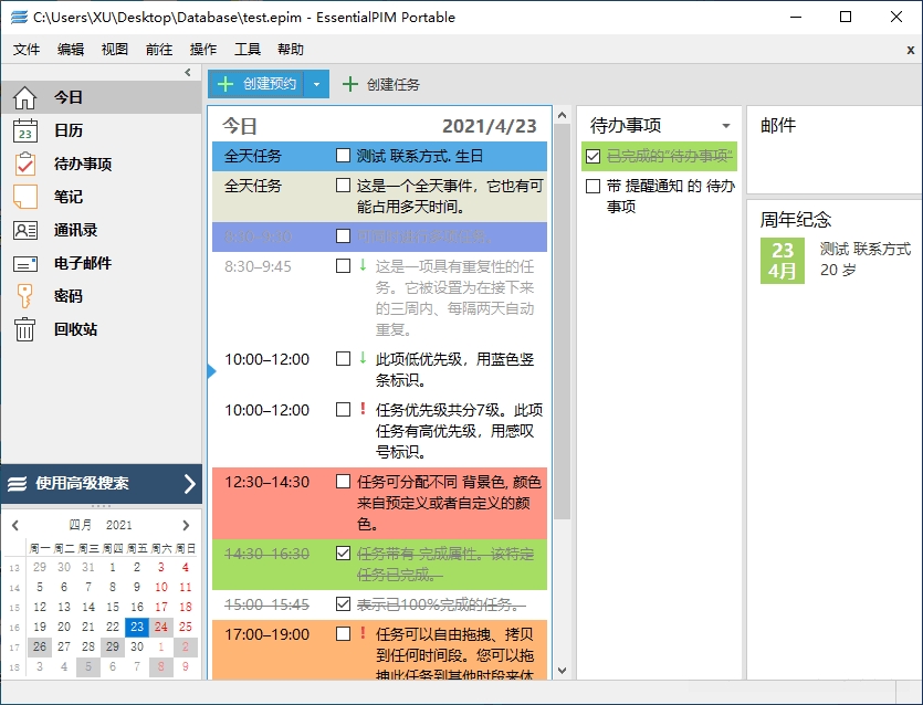 1.日程管理: EssentialPIM Free可以创建和管理事件、会议、提醒,支持重复事件设置。以日、周、月视图直观展示日程安排。