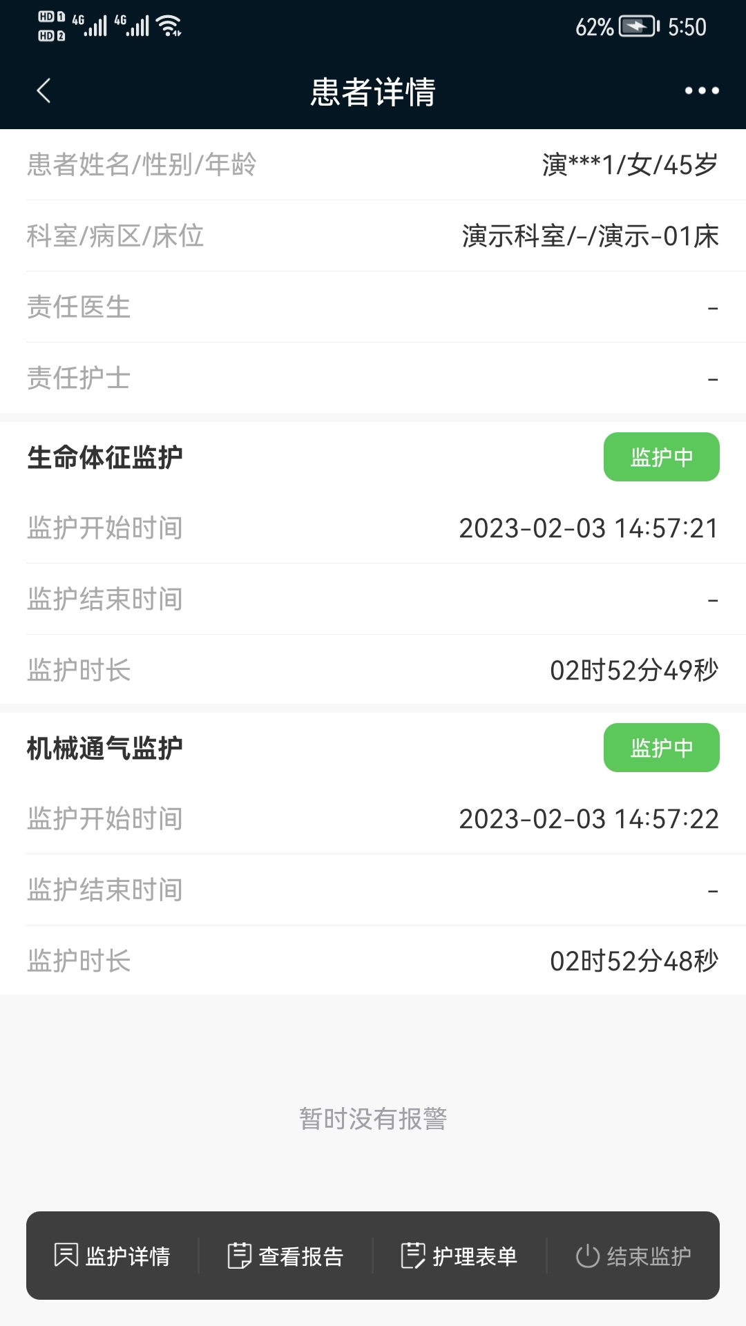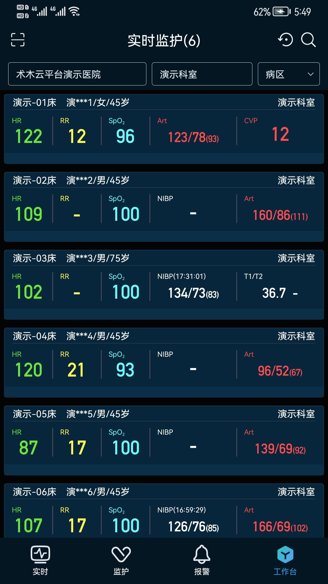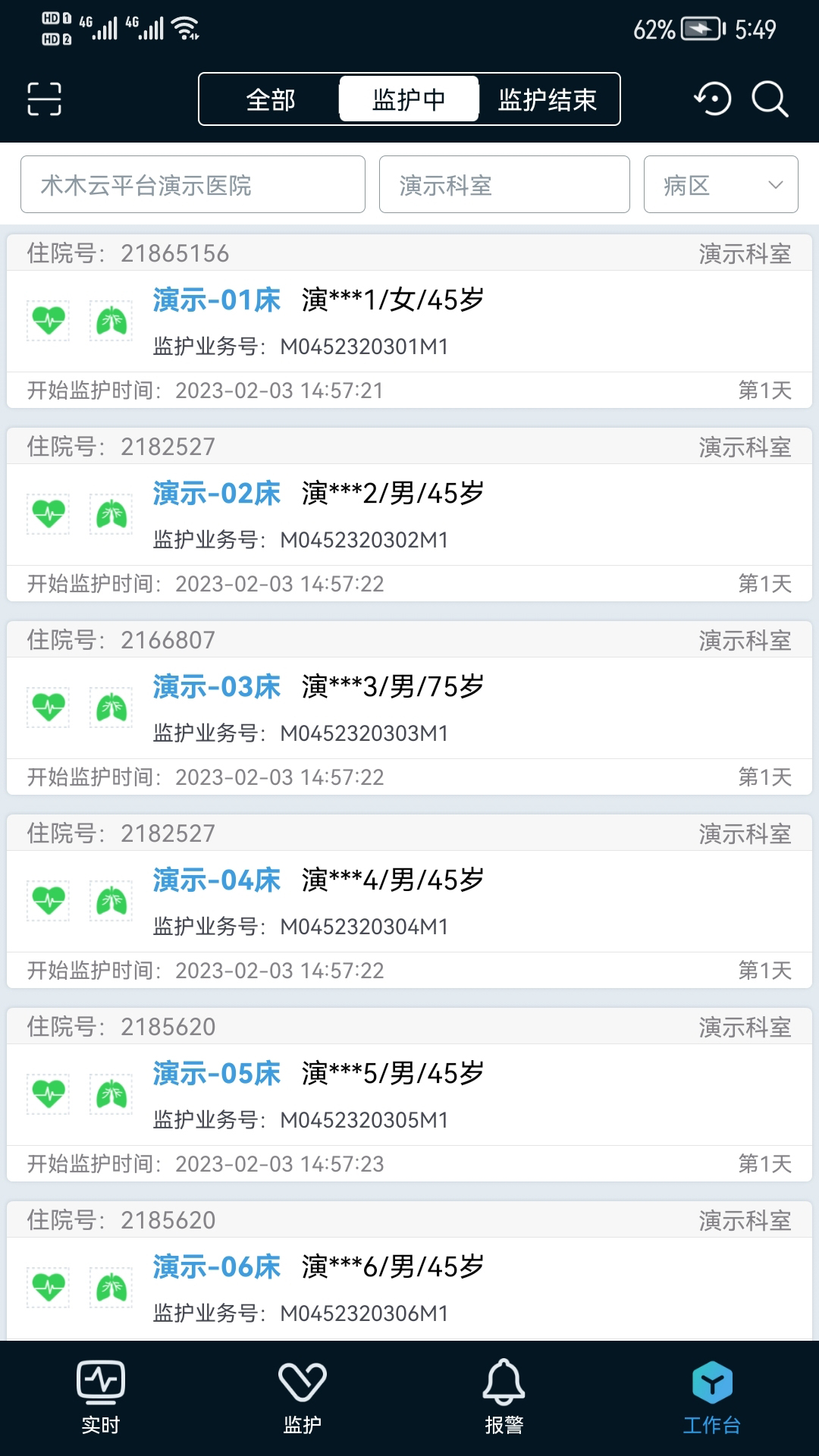 监护管理页面展示系统中正在监护中的患者列表,方便用时实时查看多个科室(医院)正在监护的生命体征直播;