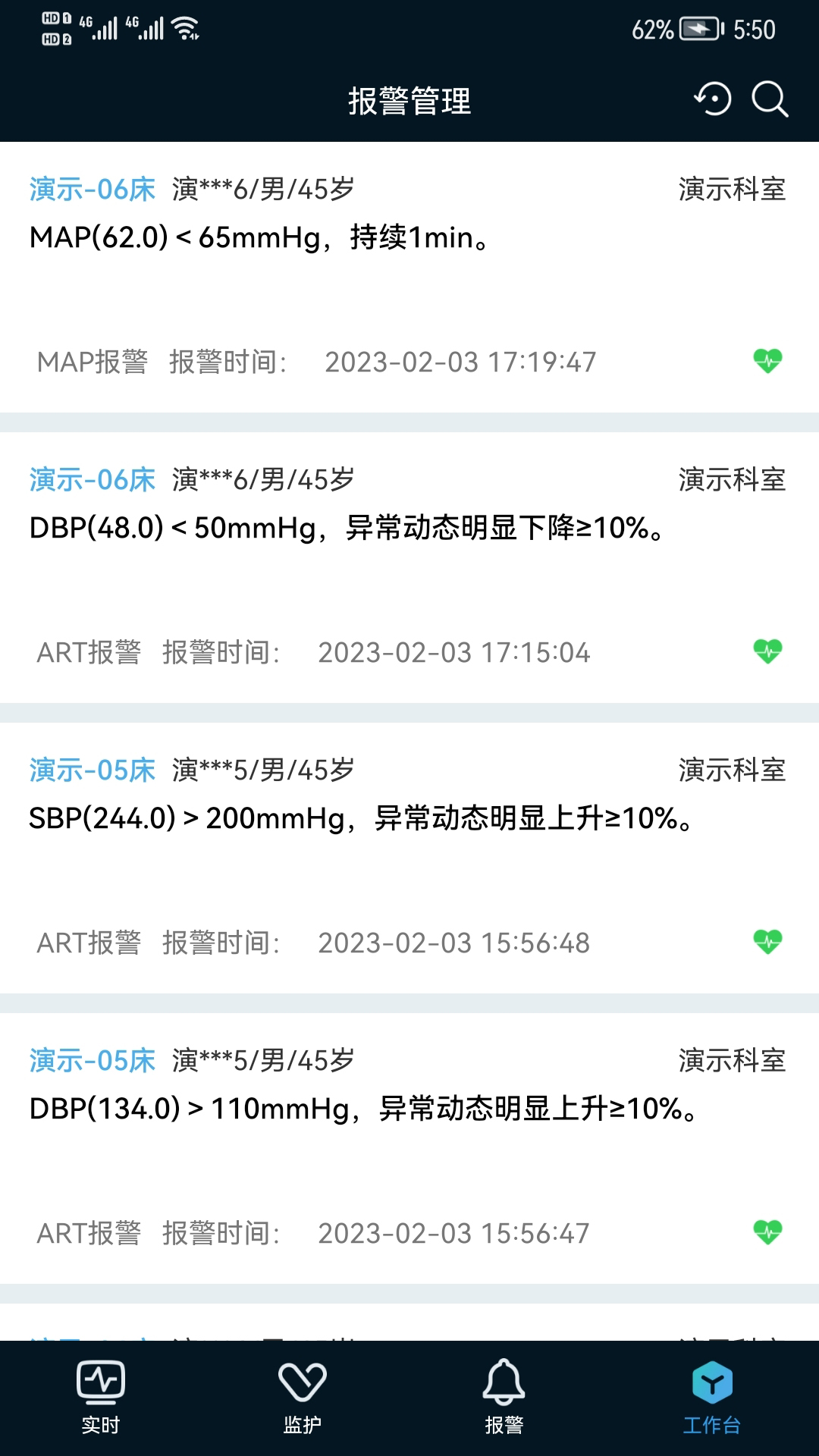 报警管理页面用于显示监护中患者所产生报警的详情页面,可查看患者报警时的生命体征参数和多参数波形页面。