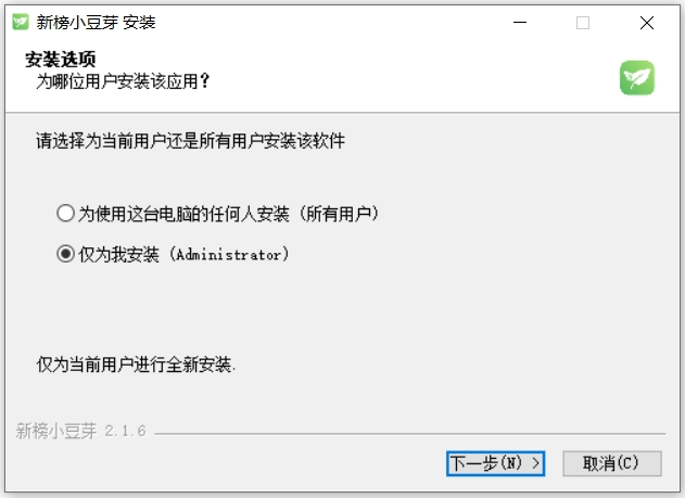 1、下载新榜小豆芽软件安装包,双击打开安装导向,选择仅为我安装,点击下一步。