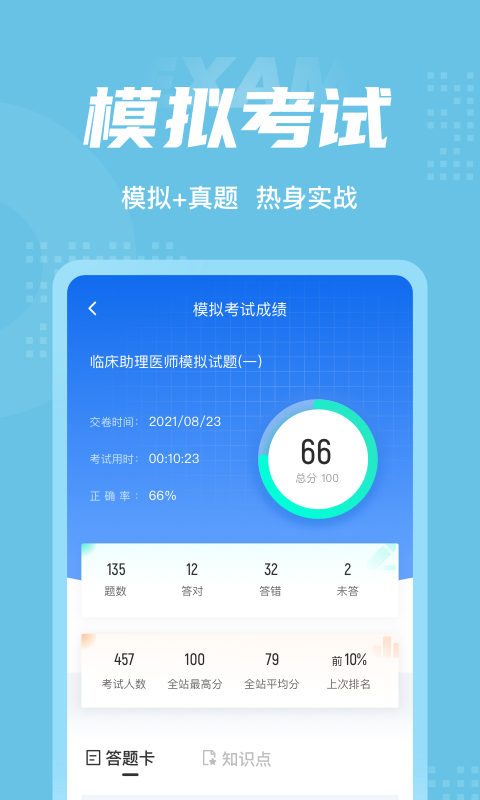 临床助理医师题库内含考点练习,全国通用卷以及地区卷模拟练习,以及按照固定考试比重的随机式的抽题的真题考场,成绩单实时记录考试数据,一点一滴的反馈考生近期学习状态以及自我正确率的提升,大大的给予考生通过考试的信心。