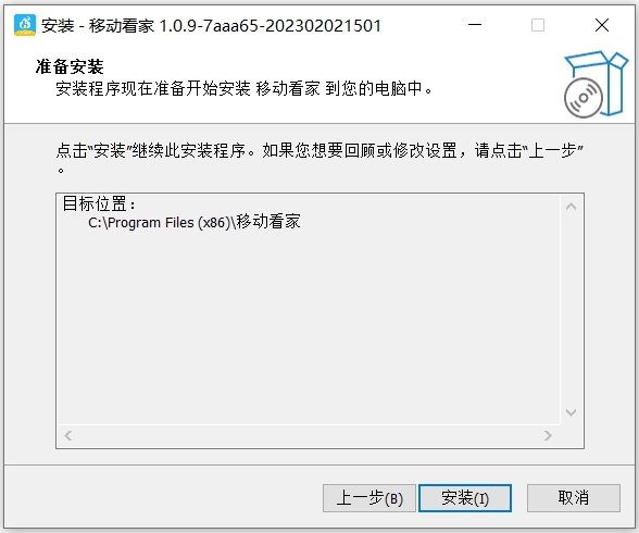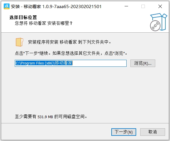 1、下载移动看家软件安装包,双击打开安装导向,点击“浏览”,选任意盘安装路径,点下一步。