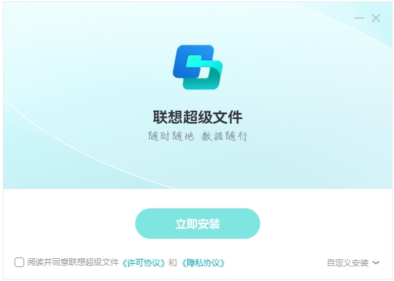 1、打开联想超级文件软件安装包,同意许可协议,自定义安装可以选任意盘安装路径,点击立即安装。