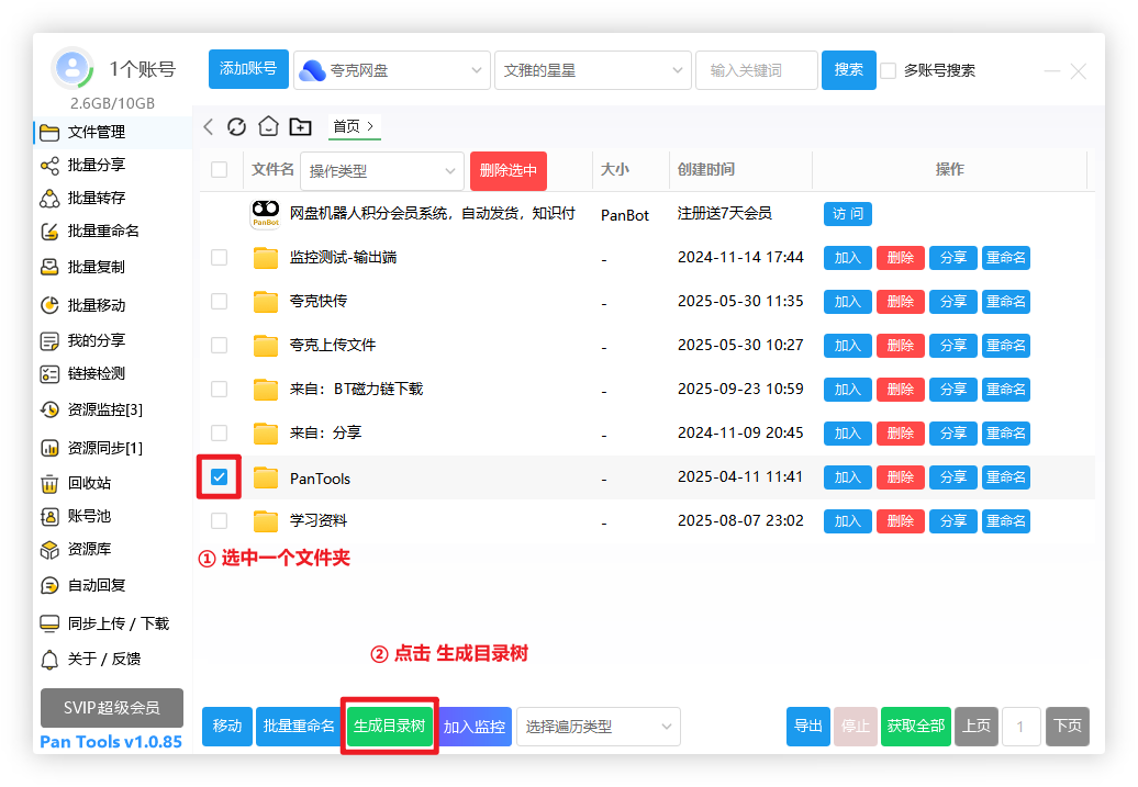 3、高效批量管理:PanTools(网盘管理工具)支持各种网盘的批量操作,包括批量删除和给文件夹批量添加广告文件。