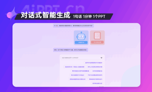 1、AI全流程赋能:AiPPT从主题输入到文案生成,再到模板匹配,AI贯穿始终,真正实现一键式轻松创作。