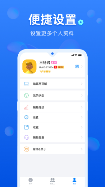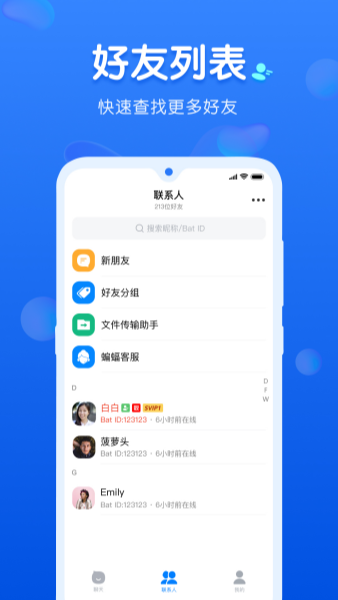 3、好友分组管理:蝙蝠支持将聊天列表进行分组管理,可快速定位并显示不同的聊天对象。