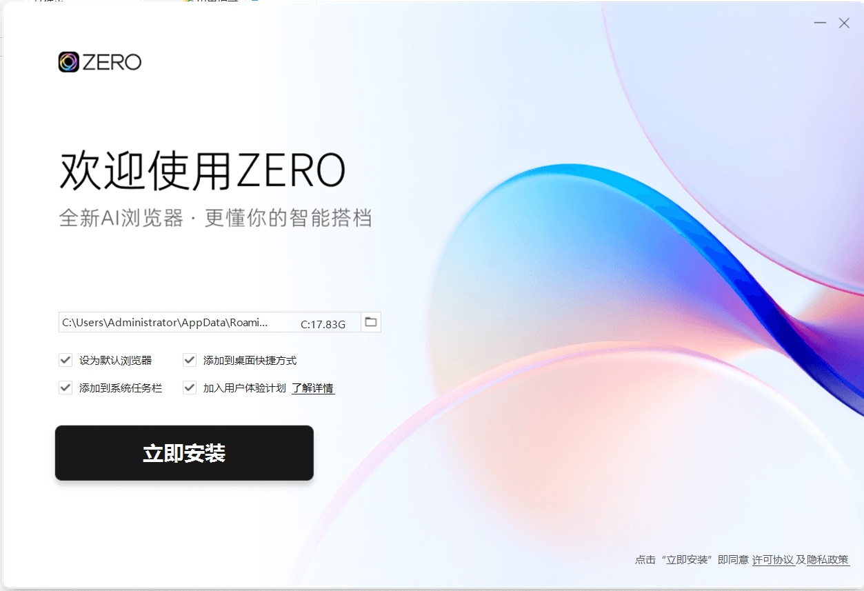 1、打开ZERO浏览器软件安装包,同意许可协议,自定义安装可以选任意盘安装路径,点击立即安装。