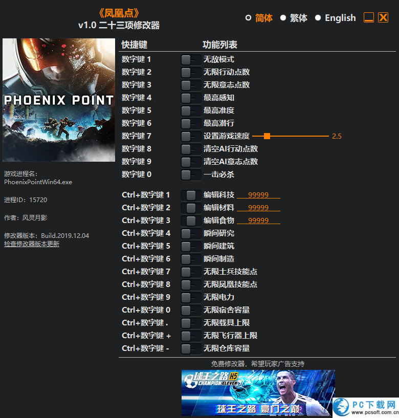 凤凰点是一款策略战棋游戏,玩家需组建小队对抗变异生物,通过战术部署和基地建设拯救末世人类。凤凰点二十三项修改器是风灵月影为凤凰点游戏打造的一款非常实用的游戏辅助工具。凤凰点修改器提供无敌、无限资源、瞬间建造等核心功能,大幅简化游戏进程,让玩家轻松体验策略乐趣。