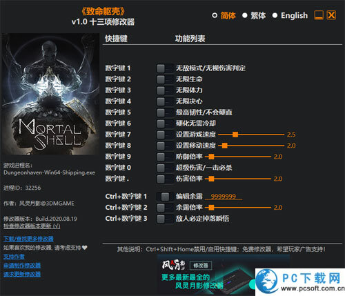 致命躯壳是一款黑暗奇幻动作RPG,玩家操控可附身不同躯壳的战士,在充满恐怖生物的世界中探索并展开硬核战斗。致命躯壳十三项修改器是风灵月影为致命躯壳游戏打造的一款非常实用的游戏辅助工具。致命躯壳修改器提供无敌模式、无限生命、超级伤害等核心功能,大幅降低游戏难度,让玩家轻松体验战斗乐趣,自由探索游戏世界。