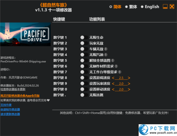 驾驶神秘旅行车探索超自然区域,在诡异天象中求生并收集资源修复车辆。超自然车旅十一项修改器是风灵月影为超自然车旅游戏打造的一款非常实用的游戏辅助工具。超自然车旅修改器提供无限生命、车辆无敌、无限汽油等核心功能,大幅提升生存与探索体验,让玩家专注享受超自然世界的冒险乐趣。