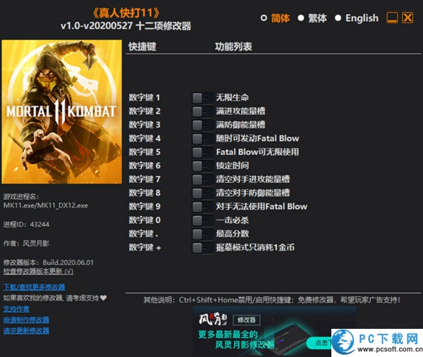 真人快打11是一款以血腥终结技为特色的格斗游戏,玩家需掌握连招与战术击败对手,延续系列神话世界观。真人快打11十二项修改器是风灵月影为真人快打11游戏打造的一款非常实用的游戏辅助工具。真人快打11修改器提供无限生命、满能量槽及一击必杀等功能,大幅增强单机战斗爽快感,让玩家尽享碾压式对战体验。