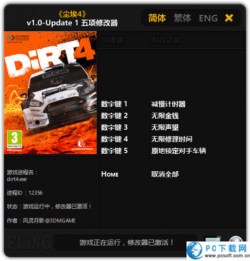 尘埃4是一款硬核拉力赛车游戏,玩家需在不同路况和天气下精准操控赛车,体验真实驾驶与策略调校。尘埃4五项修改器是风灵月影为尘埃4游戏打造的一款非常实用的游戏辅助工具。尘埃4修改器提供无限金钱、声望及锁定对手车辆功能,大幅降低游戏难度,让玩家轻松享受赛车乐趣。