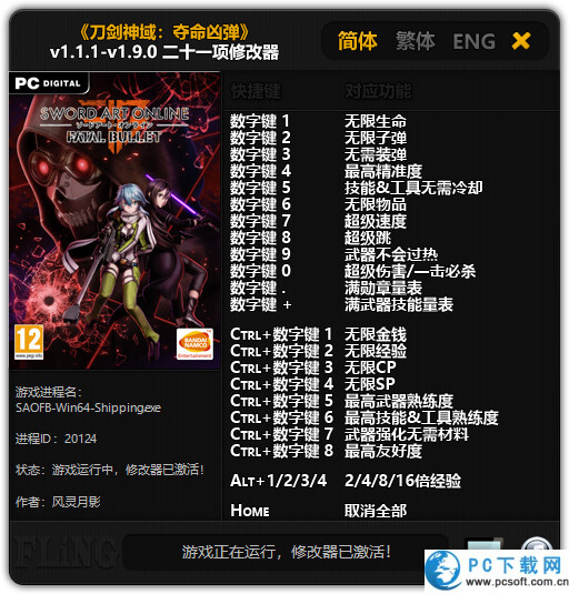 刀剑神域夺命凶弹是一款以枪战为主的角色扮演游戏,玩家在虚拟世界Gun Gale Online中冒险、组队并定制角色作战。刀剑神域夺命凶弹二十一项修改器是风灵月影为刀剑神域夺命凶弹游戏打造的一款非常实用的游戏辅助工具。刀剑神域夺命凶弹修改器提供无限生命、无限子弹、超级伤害等核心功能,大幅提升战斗爽快感,让玩家轻松体验游戏剧情与角色养成。