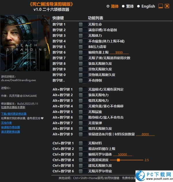 玩家扮演快递员山姆,在末日后的美国通过运送物资重建断裂的社会联系,核心玩法是策略性运输与连接网络。死亡搁浅导演剪辑版修改器是风灵月影为死亡搁浅导演剪辑版游戏打造的一款非常实用的游戏辅助工具。死亡搁浅导演剪辑版修改器提供无限生命、无限体力、无敌模式等核心功能,大幅提升生存与建造体验,让玩家专注剧情探索与物资配送。