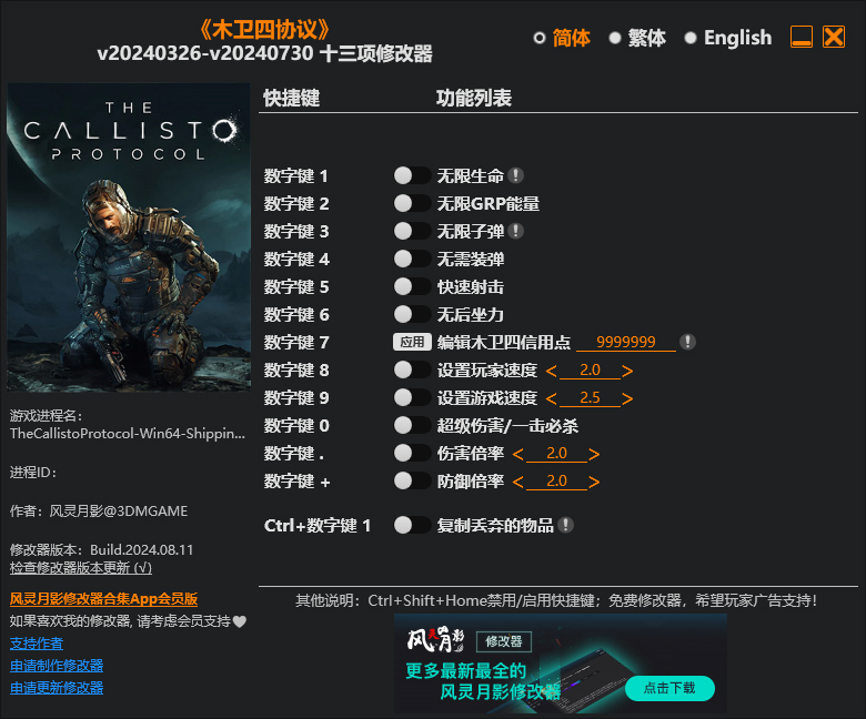 木卫四协议是一款在木星卫星上对抗变异生物的恐怖生存游戏,主打近战搏斗与资源管理。木卫四协议修改器是风灵月影为木卫四协议游戏打造的一款非常实用的游戏辅助工具。木卫四协议修改器提供无限生命、无限子弹、一招致命等核心功能,大幅降低游戏难度,让玩家轻松体验剧情与战斗乐趣。