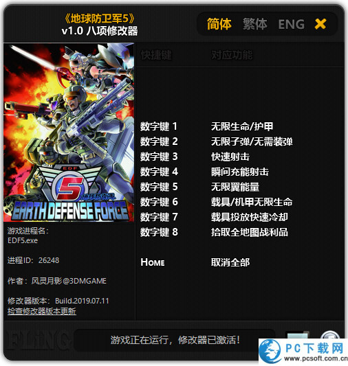 地球防卫军5是一款玩家扮演未来士兵,在开放世界中对抗外星入侵者,通过多样武器和职业协作完成任务的第三人称射击游戏。地球防卫军5八项修改器是风灵月影为地球防卫军5游戏打造的一款非常实用的游戏辅助工具。地球防卫军5修改器提供无限生命、无限子弹及快速射击等核心功能,大幅提升单机游戏爽快感,让玩家轻松体验战斗乐趣。