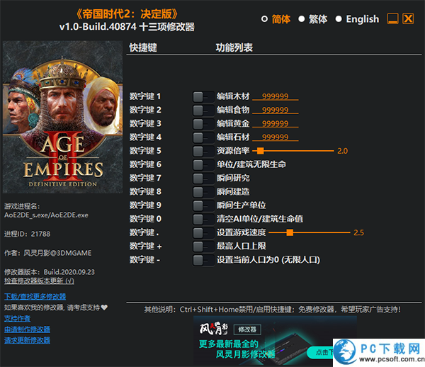 帝国时代2决定版是一款以中世纪历史为背景的即时战略游戏,玩家需建设文明、发展经济、组建军队并征服对手。帝国时代2决定版十三项修改器是风灵月影为帝国时代2决定版游戏打造的一款非常实用的游戏辅助工具。帝国时代2决定版单机修改器提供资源编辑、无限生命、瞬间建造等核心功能,大幅优化游戏节奏与策略自由度,让玩家畅享自定义对战体验。