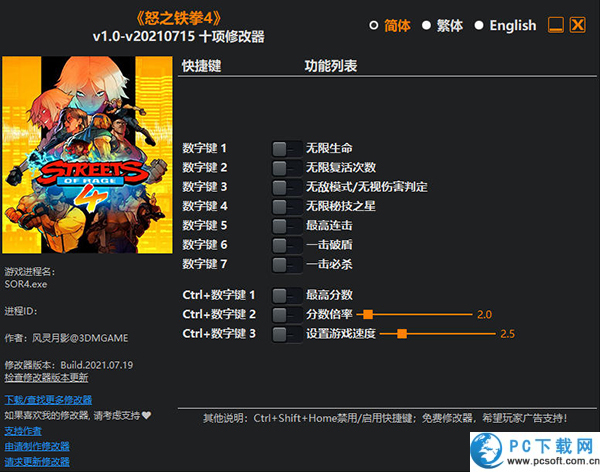 怒之铁拳4是一款横版清关动作游戏,玩家扮演英雄在城市街头对抗黑恶势力,通过连招与必杀技击败敌人。怒之铁拳4修改器是风灵月影为怒之铁拳4游戏打造的一款非常实用的游戏辅助工具。怒之铁拳4修改器提供无限生命、一击必杀与最高连击三大核心功能,助你畅享割草快感,轻松体验街机闯关的极致乐趣。