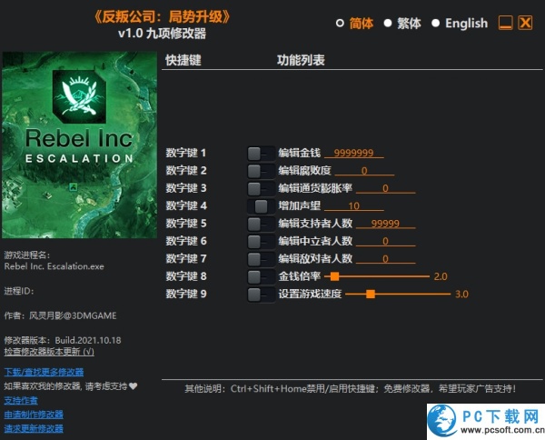 玩家作为地区管理者,通过平衡民生、军事和腐败来平定叛乱、稳定政权。反叛公司修改器是风灵月影为反叛公司游戏打造的一款非常实用的游戏辅助工具。这款反叛公司修改器提供金钱、腐败度等关键参数调整,助你轻松掌控经济与民心,优化策略体验,畅享游戏乐趣。