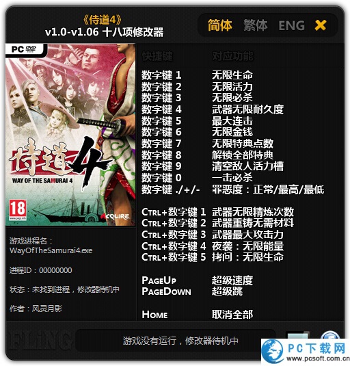 侍道4是一款以日本战国末期为背景的开放世界动作游戏,玩家扮演武士通过自由抉择影响剧情走向,体验刀剑战斗与道德抉择。侍道4修改器是风灵月影为侍道4游戏打造的一款非常实用的游戏辅助工具。侍道4修改器提供无限生命、无限金钱、一击必杀等功能,助你轻松体验剧情,畅享战斗快感,无需担忧资源与挑战。