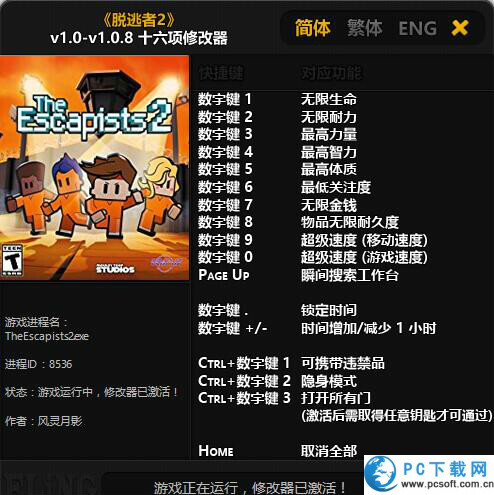 脱逃者2是一款以越狱为主题的沙盒策略游戏,玩家需在监狱中搜集道具、制定计划并突破防线成功逃脱。脱逃者2十六项修改器是风灵月影为脱逃者2游戏打造的一款非常实用的游戏辅助工具。脱逃者2修改器提供无限生命、隐身模式及瞬间搜索等核心功能,大幅降低游戏难度,让玩家专注于策略逃脱,获得更自由的单机体验。
