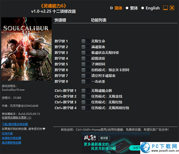 灵魂能力6是一款以武器格斗为核心的3D动作游戏,玩家操控各具特色的角色在奇幻世界中展开宿命对决。灵魂能力6修改器是风灵月影为灵魂能力6游戏打造的一款非常实用的游戏辅助工具。灵魂能力6修改器提供无限生命、满魂量表、无限魂魄点数等核心功能,大幅提升单机战斗爽快感,让玩家尽享碾压式格斗乐趣。