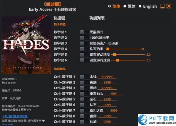 哈迪斯地狱之战是一款希腊神话题材的Roguelike动作游戏,玩家扮演冥王之子扎格列欧斯,通过不断挑战地狱关卡、获取神力,试图逃离冥界。哈迪斯地狱之战十五项修改器是风灵月影为哈迪斯地狱之战游戏打造的一款非常实用的游戏辅助工具。哈迪斯地狱之战修改器提供一键资源修改,可无限获取金钱、宝石、泰坦之血等关键道具,大幅降低战斗难度,优化资源收集体验。