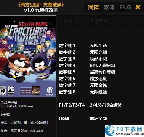 玩家扮演小镇新孩子,通过回合制战斗和伙伴协作,揭露小镇阴谋并拯救南方公园。南方公园完整破碎九项修改器是风灵月影为南方公园游戏打造的一款非常实用的游戏辅助工具。南方公园修改器提供无限生命、无限金钱、超级速度等核心功能,大幅提升游戏爽快感,让玩家轻松体验剧情与战斗乐趣。