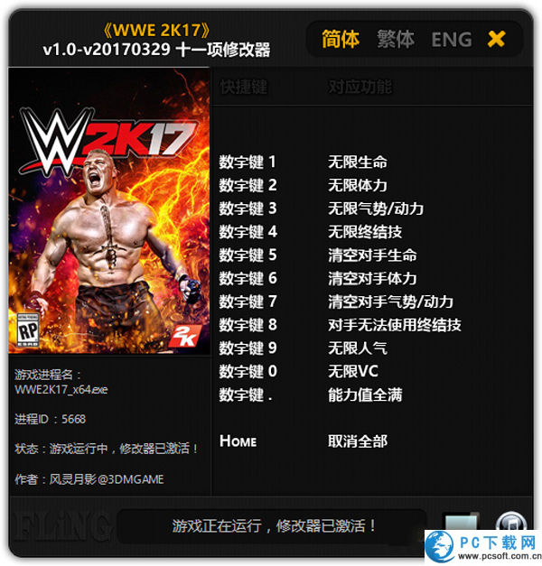 美国职业摔角联盟2K17是一款以真实摔角明星和赛事为核心的体育模拟游戏,玩家可体验职业摔角的激烈对抗与角色养成。美国职业摔角联盟2K17十一项修改器是风灵月影为美国职业摔角联盟2K17游戏打造的一款非常实用的游戏辅助工具。WWE 2K17修改器提供无限生命、体力及人气等核心功能,大幅简化游戏操作,让玩家畅享主宰赛场的沉浸式摔角体验。