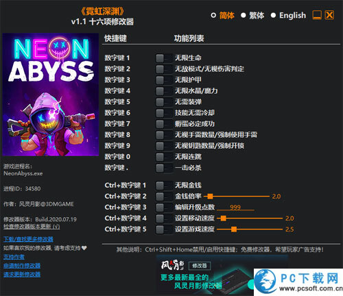 霓虹深渊是一款融合了roguelike元素的横版地牢射击游戏,玩家在霓虹闪烁的地下世界中探索、战斗并收集道具,通过无限叠加能力挑战随机生成的关卡。霓虹深渊十六项修改器是风灵月影为霓虹深渊游戏打造的一款非常实用的游戏辅助工具。霓虹深渊修改器提供无敌、无限资源、技能无冷却等功能,大幅降低游戏难度,让玩家畅享割草快感与自由探索体验。