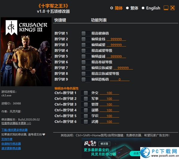 玩家扮演中世纪贵族,通过联姻、战争和阴谋扩张家族势力,体验王朝兴衰的策略游戏。王国风云3十五项修改器是风灵月影为王国风云3游戏打造的一款非常实用的游戏辅助工具。王国风云3修改器提供一键满血、无限金钱、最高威望等核心功能,大幅简化资源管理,增强角色能力,让玩家更专注于战略与剧情体验。