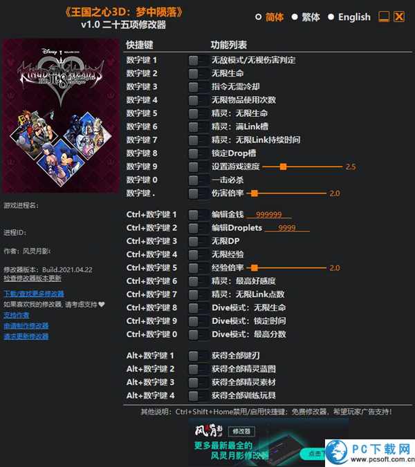 操控索拉与利库穿越梦境世界,通过自由下落战斗和精神联动系统对抗梦魇侵蚀。王国之心3D梦中陨落修改器是风灵月影为王国之心3D梦中陨落游戏打造的一款非常实用的游戏辅助工具。王国之心3D修改器提供无敌模式、无限生命、一击必杀等核心功能,大幅降低战斗难度,同时支持资源修改与精灵强化,让玩家专注体验剧情与探索。